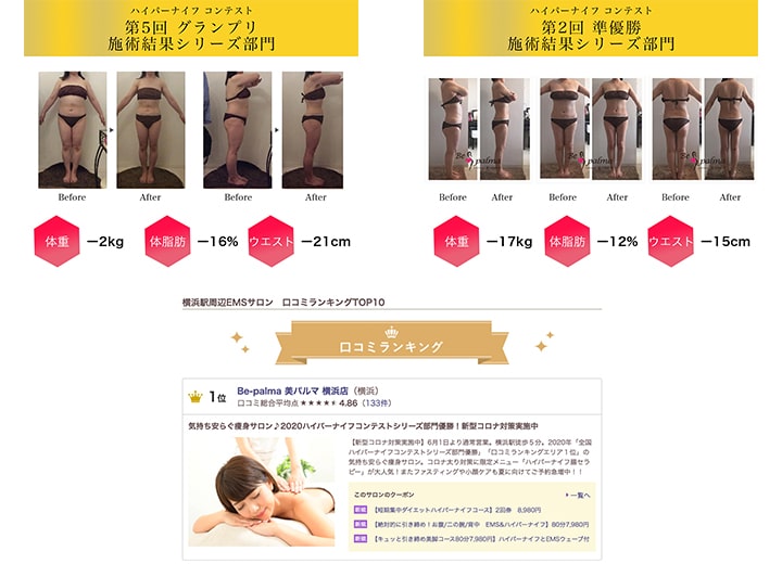 Be-palma 美パルマは、ハイパーナイフコンテストや美肌コンテストで優勝を果たした実績を持つ、結果重視のエステサロンです。